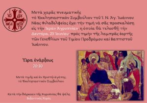 Τη Δευτέρα, 23 Ιουνίου 2025, στις 20:30 μ.μ., στον Ι. Ναό Αγίου Ιωάννου Φιλαδέλφειας, θα τελεστεί Αγρυπνία για την εορτή του Γενεθλίου του Τιμίου Προδρόμου.
