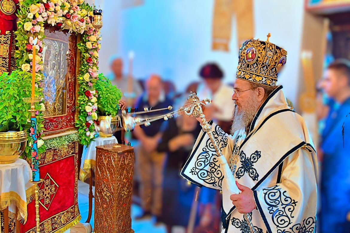 Τον λόγο διακόνησε ο Σεβ. Ιερισσού κ. ΘΕΟΚΛΗΤΟΣ, ο οποίος μιλώντας για το Πρόσωπο της Κυρίας Θεοτόκου είπε ότι είναι το γλυκύτερο όνομα και πρόσωπο που πλουτίζει και ομορφαίνει τα εσώψυχα του ανθρώπου αλλά και του Αγγελικού Κόσμου. Η Παντάνασσα, συνέχισε, είναι η υπάκουη ανταπόκριση του ανθρώπου στην πρόσκληση του Θεού για τη σωτηρία του κόσμου, η Οποία όχι μόνο συναίνεσε, αλλά και με το αίμα Της και με τα οστά Της δάνεισε την ανθρώπινη φύση στον Υιό και Λόγο του Θεού και Τον γέννησε ως Θεάνθρωπο. Αυτό το πρόσωπο, το οποίο είναι ουσιαστικά η συναίτιος της σωτηρίας μας, κατά το Πάσχα του καλοκαιριού τιμά και προσεγγίζει το Χριστώνυμο Πλήρωμα και το παρακαλεί για την ευστάθεια του κόσμου και για τη σταθερή πορεία του ανθρώπινου Γένους.