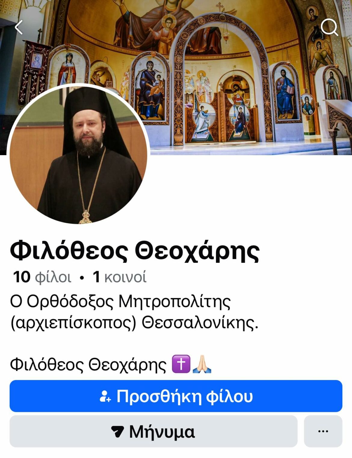 Ενημερώνουμε τους χρήστες του διαδικτύου για μία νέα απόπειρα διαδικτυακής απάτης με θύμα το πρόσωπο του Μητροπολίτου Θεσσαλονίκης Φιλοθέου, καθόσον το εμφανισθέν προφίλ του μέσου κοινωνικής δικτύωσης Facebook με όνομα “Φιλόθεος Θεοχάρης – ο Ορθόδοξος Μητροπολίτης (αρχιεπίσκοπος) Θεσσαλονίκης” και φωτογραφία του Μητροπολίτου Θεσσαλονίκης Φιλοθέου είναι ΨΕΥΔΕΣ και, ως εκ τούτου, καλούνται όσοι έχουν λογαριασμό στο μέσο αυτό κοινωνικής δικτύωσης, να απέχουν από οποιαδήποτε σύνδεση ή επικοινωνία με τους κρυπτομένους πίσω από αυτήν την διαδικτυακή απάτη.