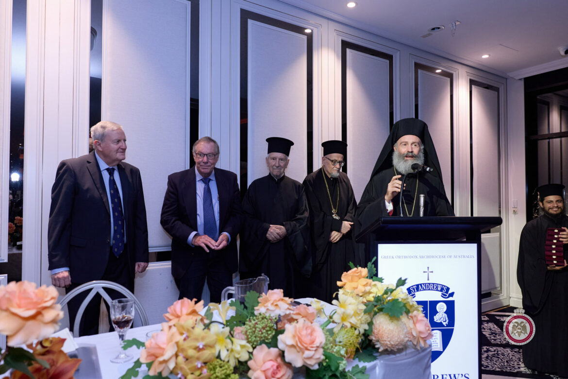 Με την ευκαιρία της παρουσίας στο Δείπνο εκπροσώπων του Αυστραλιανού Συνδέσμου Θεολογικών Σπουδών (Australian University College of Divinity), ο Σεβασμιώτατος απηύθυνε ευχαριστίες προς την ηγεσία και το διοικητικό συμβούλιο του φορέα, για τη σοφή καθοδήγηση, την αυστηρή ακαδημαϊκή εποπτεία και την αδελφική υποστήριξη που παρέχουν στη Θεολογική Σχολή του Αποστόλου Ανδρέου. «Αυτή η διαρκής συνεργασία ήταν, και παραμένει, ουσιώδης για την άνθηση της Θεολογικής Σχολής μας», ανέφερε, «και για την αξιοπιστία της Ορθόδοξης θεολογικής επιστήμης στον ακαδημαϊκό χώρο της Αυστραλίας».