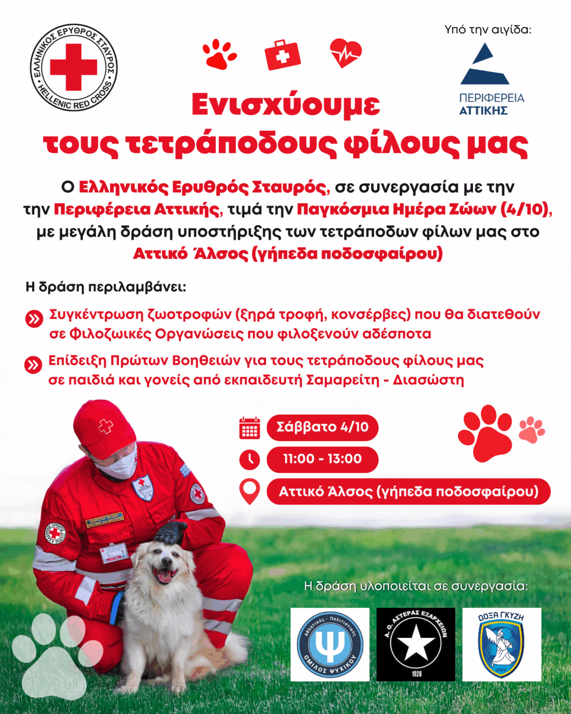 Ο Ελληνικός Ερυθρός Σταυρός (Ε.Ε.Σ.), με αφορμή την Παγκόσμια Ημέρα Ζώων (4/10), διοργανώνει, μεγάλη δράση υποστήριξης των τετράποδων φίλων μας, το Σάββατο (4/10), στο Αττικό Άλσος (γήπεδα ποδοσφαίρου), από τις 11:00 έως τις 13:00. Η δράση τελεί υπό την αιγίδα της Περιφέρειας Αττικής.