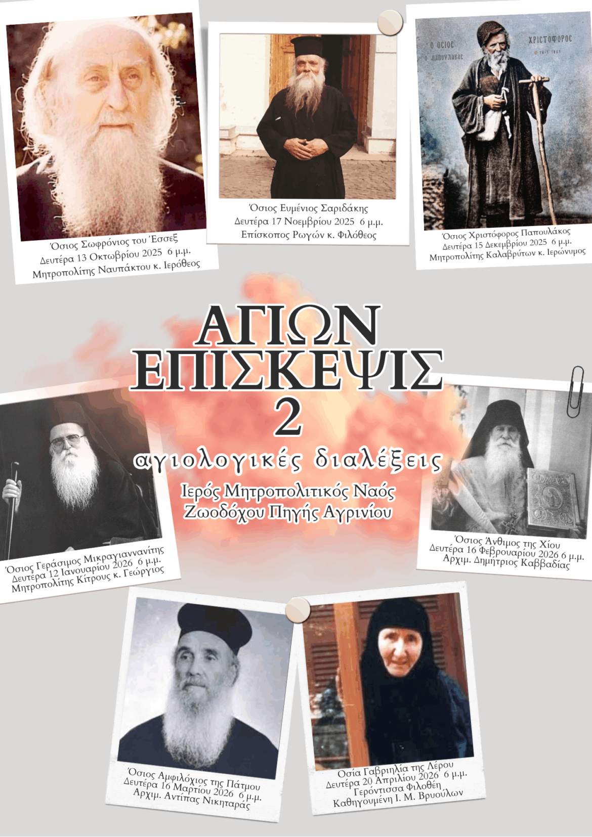 Για δεύτερη χρονιά θα πραγματοποιηθεί στον Ιερό Μητροπολιτικό Ναό Ζωοδόχου Πηγής Αγρινίου η σειρά των μηνιαίων Αγιολογικών Διαλέξεων, με γενικό τίτλο «Αγίων Επίσκεψις 2» αφιερωμένες σε νεοφανείς Αγίους της εποχής μας.