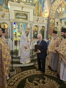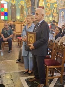 Στο τέλος δε και προ το πέρας της Θείας Λειτουργίας, ο κ. Ειρηναίος ετίμησε τον Πρόεδρο του Ελληνικού Ερυθρού Σταυρού, Δρα κ. Αντώνιο Αυγερινό, για την όλη συμβολή και προσφορά του στη Μητρόπολη Φλωρίνης, δωρίζοντας τιμητικά σε αυτόν μια φιλότεχνη Ιερά Εικόνα της Παναγίας, ευχόμενος, παράλληλα, κάθε ευλογία προσωπική και οικογενειακή αλλά και εν γένει στο πλούσιο φιλανθρωπικό του έργο, από Θεού.