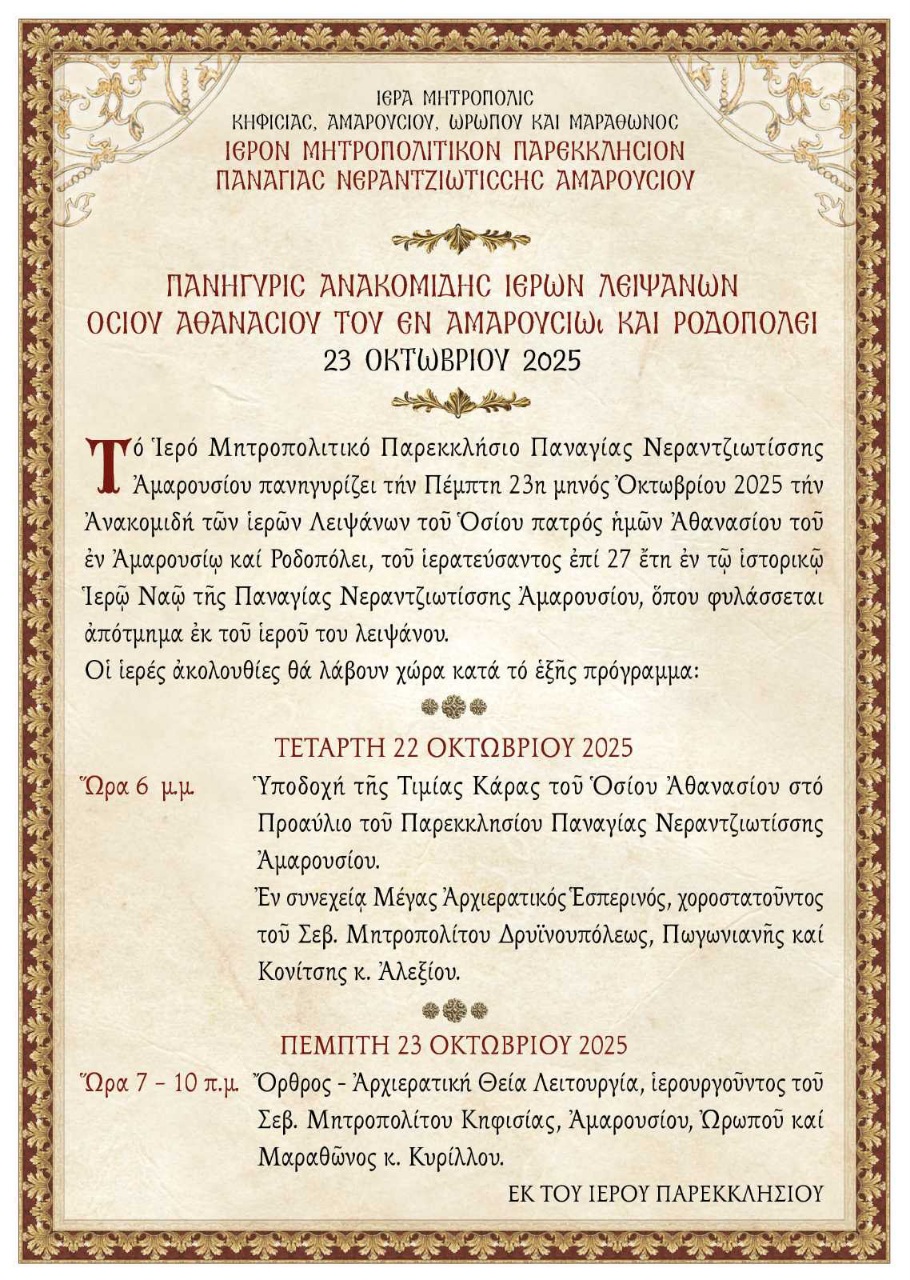 ΕπικαιρότηταΜητροπόλεις Πανήγυρις Ανακομιδής Ι. Λειψάνων Οσίου Αθανασίου στη Μητρόπολη Κηφισίας από ikivotos 17 Οκτωβρίου 2025 Συντάκτης ikivotos 17 Οκτωβρίου 2025 34 Μητρόπολη Κηφισιάς Μοιρασου 0 FacebookTwitterPinterestEmail Προηγούμενο άρθρο Έναρξη μαθημάτων στις Σχολές Βυζαντινής Μουσικής της Ι. Μ. Αιτωλοακαρνανίας (ΦΩΤΟ) Επόμενο άρθρο Επετειακή Εκδήλωση για τα 1700 χρόνια από την Α΄ Οικουμενική Σύνοδο στη Μητρόπολη Φλωρίνης ΔΕΙΤΕ ΕΠΙΣΗΣ Με λαμπρότητα τα Ονομαστήρια του Μητροπολίτη Εδέσσης κ.... Εκδήλωση για την Α΄ Οικ. Σύνοδο στη Μητρόπολη... Καισαριανής Δανιήλ: «Εις σωτηρίαν παντί τω πιστεύοντι» Ο Ελληνικός Ερυθρός Σταυρός διοργανώνει ανοιχτή Δράση Πρόληψης... Αγιασμός έναρξης στο Ωδείο της Μητροπόλεως Πειραιώς (ΦΩΤΟ) «Οι δημοκράτισσες της αρχαίας Αθήνας»: Θεατρική παράσταση στο...
