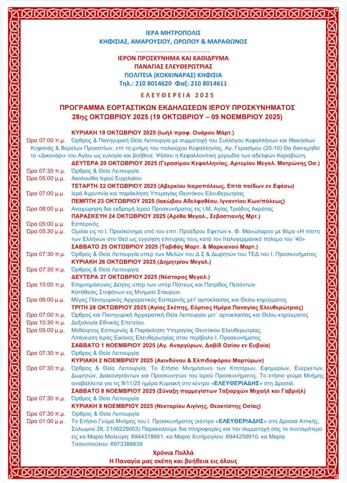 ΕπικαιρότηταΜητροπόλεις Πρόγραμμα εορταστικών εκδηλώσεων Παναγίας Ελευθερώτριας Κηφισιάς από ikivotos 20 Οκτωβρίου 2025 Συντάκτης ikivotos 20 Οκτωβρίου 2025 40 Screenshot Μητρόπολη Κηφισιάς Μοιρασου 0 FacebookTwitterPinterestEmail Προηγούμενο άρθρο Πότε νοσούμε από τη νόσο του διαβόλου Επόμενο άρθρο Ο Μητροπολίτης Χρυσόστομος τέλεσε τον Αγιασμό στην Α.Ε.Ν. Πρέβεζας ΔΕΙΤΕ ΕΠΙΣΗΣ Εσπερινός στο παρεκκλήσιο του Αγίου Αρτεμίου στην Αστυνομική... Ο Μητροπολίτης Χρυσόστομος τέλεσε τον Αγιασμό στην Α.Ε.Ν.... Έναρξη «ΔΗΜΗΤΡΙΩΝ 2025» στη Μητρόπολη Τρίκκης Μητροπολίτης Πειραιώς: Ο θάνατος δεν δημιουργήθηκε από τον... Ο Ελληνικός Ερυθρός Σταυρός ολοκληρώνει την μεγάλη εκστρατεία... Με λαμπρότητα τα Ονομαστήρια του Μητροπολίτη Εδέσσης κ....
