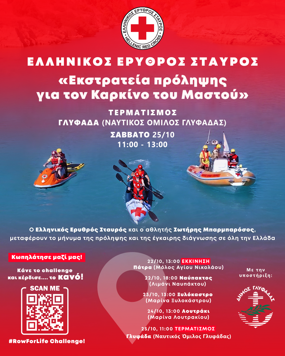 Ο Ελληνικός Ερυθρός Σταυρός διοργανώνει το Σάββατο (25/10) και ώρες 11:00 έως 13:00, στον Ναυτικό Όμιλο Γλυφάδας (Διαδόχου Παύλου 42), μεγάλη εκδήλωση ενημέρωσης, ευαισθητοποίησης και πρόληψης για τον καρκίνο του μαστού, η οποία θα συνδυαστεί με τον τερματισμό της μεγάλη εκστρατείας που διοργανώνει ο Ε.Ε.Σ. με τον αθλητή μεγάλων αποστάσεων, Σωτήρη Μπαρμπαρόσο, ο οποίος, έχοντας στο πλευρό του ανεμόπτερο, ναυαγοσωστική λέμβο και διασωστικό jet ski του Ελληνικού Ερυθρού Σταυρού, θα κωπηλατήσει με κανό περίπου 110 ναυτικά μίλια από την Πάτρα (22/10) έως την Αθήνα (25/10), με ενδιάμεσες στάσεις σε Ναύπακτο (22/10), Ξυλόκαστρο (23/10) και Λουτράκι (24/10), μεταφέροντας ένα μήνυμα ελπίδας, δύναμης και πρόληψης για τον καρκίνο του μαστού.