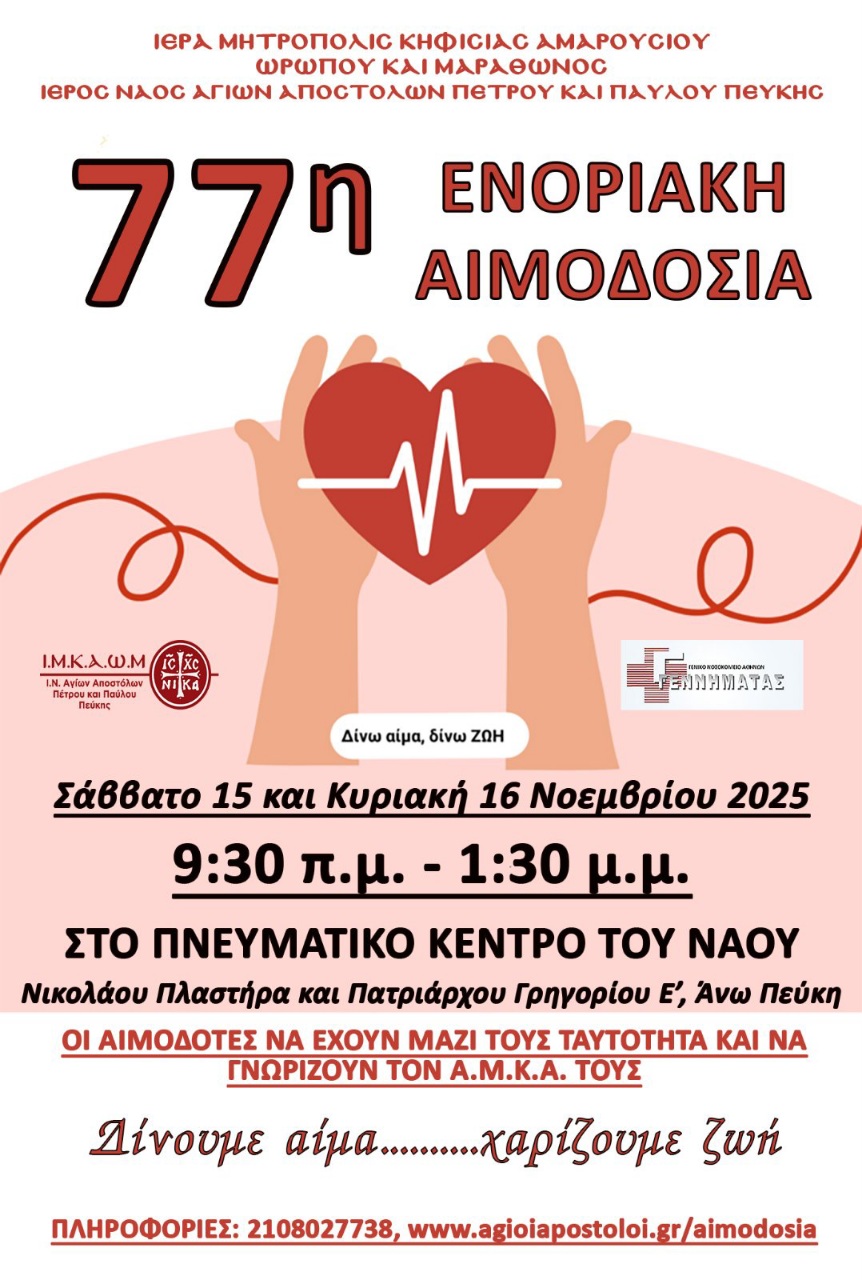 ΕπικαιρότηταΜητροπόλεις Ενοριακή Αιμοδοσία Ι. Ν. Αγίων Αποστόλων Πέτρου και Παύλου Πεύκης από ikivotos 6 Νοεμβρίου 2025 Συντάκτης ikivotos 6 Νοεμβρίου 2025 23 Μοιρασου 0 FacebookTwitterPinterestEmail Προηγούμενο άρθρο Κύκλος Μελέτης Αγίας Γραφής στον Ι. Ναό Αγίου Ιωάννου Ν. Φιλαδέλφειας Επόμενο άρθρο Η Εταιρεία Μακεδονικών Σπουδών ανακήρυξε τον Νεαπόλεως Βαρνάβα επίτιμο μέλος της ΔΕΙΤΕ ΕΠΙΣΗΣ Ο Πρόεδρος του Ελληνικού Ερυθρού Σταυρού, Dr. Αντώνιος... Η Εταιρεία Μακεδονικών Σπουδών ανακήρυξε τον Νεαπόλεως Βαρνάβα... Κύκλος Μελέτης Αγίας Γραφής στον Ι. Ναό Αγίου... Πρόγραμμα Ιεράς Πανηγύρεως Ιερού Ναού Αγίου Νεκταρίου Άργους... Φλωρίνης Ειρηναίος: Αμύνταιο και Ελευθερία Βεροίας Παντελεήμων: Οι άγιοι θέτουν τον Χριστό υπεράνω...