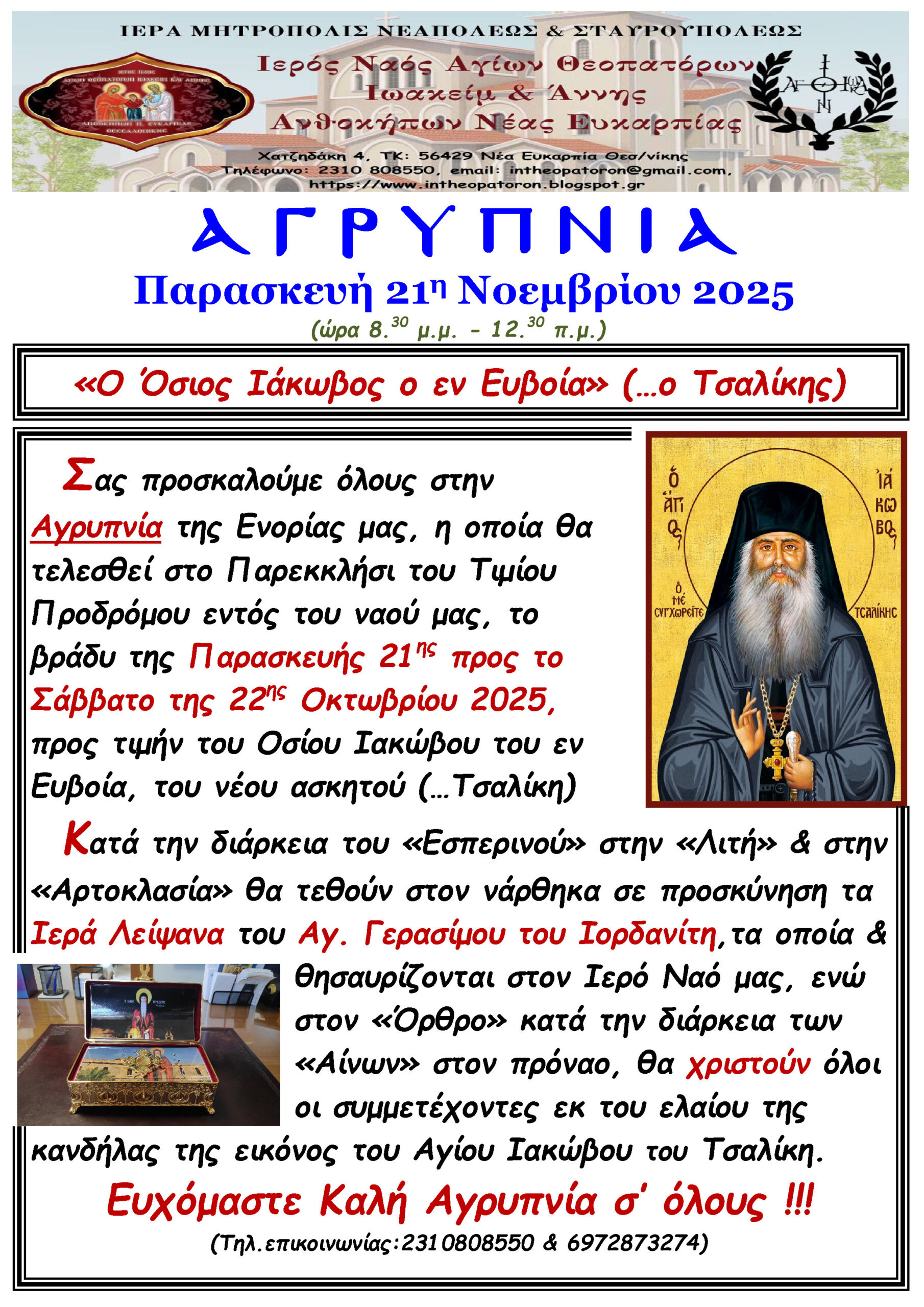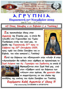 Ενορίες / Μοναστηρια / Προσκυνήματα / Μοναστηριακά ΠροϊόνταΜητροπόλεις Αγρυπνία στη Μητρόπολη Νεαπόλεως και Σταυρουπόλεως από ikivotos 14 Νοεμβρίου 2025 Συντάκτης ikivotos 14 Νοεμβρίου 2025 22 Μητρόπολη Νεαπόλεως Μοιρασου 0 FacebookTwitterPinterestEmail Προηγούμενο άρθρο O Ελληνικός Ερυθρός Σταυρός συνήψε μνημόνιο συνεργασίας με τον Δήμο Αγίων Αναργύρων – Καματερού Επόμενο άρθρο Αλεξανδρουπόλεως Άνθιμος: Θέλουμε να μας συγχωρούν χωρίς να ζητήσουμε συγνώμη (ΦΩΤΟ) ΔΕΙΤΕ ΕΠΙΣΗΣ Ολοκληρώθηκε η επίσκεψη του Κύπρου Γεωργίου στην Κέρκυρα Κορυφώθηκαν οι λατρευτικές εκδηλώσεις για τον πολιούχο της... Υποδοχή της Εικόνος της Υπεραγίας Θεοτόκου στον Ι.Ν.... Αλεξανδρουπόλεως Άνθιμος: Θέλουμε να μας συγχωρούν χωρίς να... Η ενθρόνιση του Μητροπολίτου Κορίνθου Παύλου π. Αλέξιος Ιστρατόγλου: Ο Άγιος Ιωάννης ο Χρυσόστομος...