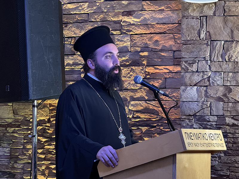 Ακολούθησε ο χαιρετισμός του Πρωτοσυγκέλλου της Ιεράς Μητροπόλεως Ύδρας, Σπετσών και Αιγίνης Αρχιμανδρίτη π. Νεκταρίου Δαρδανού, ο οποίος μετέφερε τις ευχές του Σεβασμιωτάτου Μητροπολίτου Ύδρας κ. Εφραίμ, καθώς και τις ευχαριστίες του για το έργο του Υδραϊκού Ναυτικού Ομίλου. Τόνισε δε ιδιαίτερα τη σημασία του Αγίου Κωνσταντίνου ως πνευματικού οδηγού των Υδραίων και παράδειγμα πίστεως για τους νεότερους.