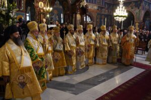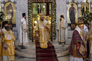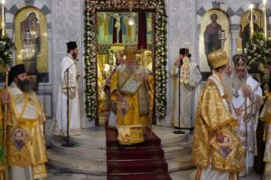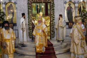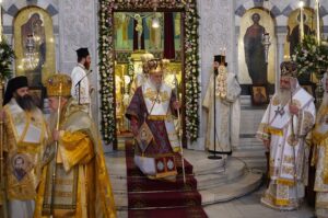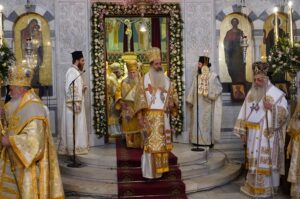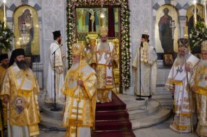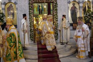 Στην πολυαρχιερατική Θεία Λειτουργία, προεξήρχε ο σεπτός Ποιμενάρχης μας κ. Παύλος, συλλειτουργούντων των Σεβασμιωτάτων Μητροπολιτών Γουμενίσσης, Αξιουπόλεως και Πολυκάστρου κ. Δημητρίου, Ναυπάκτου και Αγίου Βλασίου κ. Ιεροθέου, Χαλκίδος και Βορείων Σποράδων κ. Χρυσοστόμου, Σερβιών και Κοζάνης κ. Παύλου, Μεσσηνίας κ. Χρυσοστόμου, Θηβών, Λεβαδείας και Αυλίδος κ. Γεωργίου, Άρτης κ. Καλλινίκου Ιλίου, Αχαρνών και Πετρουπόλεως κ. Αθηναγόρου, Κηφισίας, Αμαρουσίου, Ωρωπού και Μαραθώνος κ. Κυρίλλου, Νικοπόλεως και Πρεβέζης κ. Χρυσοστόμου, Μαρωνείας και Κομοτηνής κ. Παντελεήμονος, Γρεβενών κ. Δαβίδ, Φιλίππων, Νεαπόλεως και Θάσου κ. Στεφάνου, Φθιώτιδος κ. Συμεών, Καλαβρύτων και Αιγιαλείας κ. Ιερωνύμου, του και Τοποτηρητού της Ι. Μητροπόλεώς μας, Λήμνου και Αγίου Ευστρατίου κ. Ιεροθέου, Γόρτυνος και Μεγαλοπόλεως κ. Νικηφόρου, Μαντινείας και Κυνουρίας κ. Επιφανίου, του Βοηθού Επισκόπου Κεγχρεών κ. Αγαπίου, Πρωτοσυγκέλλου της Ι. Μητροπόλεως μας και συμπροσευχομένου του Βοηθού Επισκόπου Σκοπέλου κ. Νικοδήμου, Πρωτοσυγκέλλου της Ι. Μητροπόλεως Χαλκίδος.