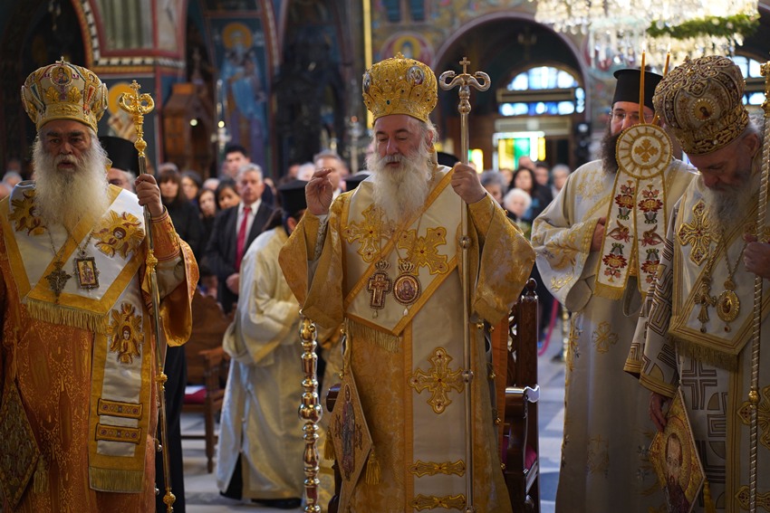 Στην πολυαρχιερατική Θεία Λειτουργία, προεξήρχε ο σεπτός Ποιμενάρχης μας κ. Παύλος, συλλειτουργούντων των Σεβασμιωτάτων Μητροπολιτών Γουμενίσσης, Αξιουπόλεως και Πολυκάστρου κ. Δημητρίου, Ναυπάκτου και Αγίου Βλασίου κ. Ιεροθέου, Χαλκίδος και Βορείων Σποράδων κ. Χρυσοστόμου, Σερβιών και Κοζάνης κ. Παύλου, Μεσσηνίας κ. Χρυσοστόμου, Θηβών, Λεβαδείας και Αυλίδος κ. Γεωργίου, Άρτης κ. Καλλινίκου Ιλίου, Αχαρνών και Πετρουπόλεως κ. Αθηναγόρου, Κηφισίας, Αμαρουσίου, Ωρωπού και Μαραθώνος κ. Κυρίλλου, Νικοπόλεως και Πρεβέζης κ. Χρυσοστόμου, Μαρωνείας και Κομοτηνής κ. Παντελεήμονος, Γρεβενών κ. Δαβίδ, Φιλίππων, Νεαπόλεως και Θάσου κ. Στεφάνου, Φθιώτιδος κ. Συμεών, Καλαβρύτων και Αιγιαλείας κ. Ιερωνύμου, του και Τοποτηρητού της Ι. Μητροπόλεώς μας, Λήμνου και Αγίου Ευστρατίου κ. Ιεροθέου, Γόρτυνος και Μεγαλοπόλεως κ. Νικηφόρου, Μαντινείας και Κυνουρίας κ. Επιφανίου, του Βοηθού Επισκόπου Κεγχρεών κ. Αγαπίου, Πρωτοσυγκέλλου της Ι. Μητροπόλεως μας και συμπροσευχομένου του Βοηθού Επισκόπου Σκοπέλου κ. Νικοδήμου, Πρωτοσυγκέλλου της Ι. Μητροπόλεως Χαλκίδος.