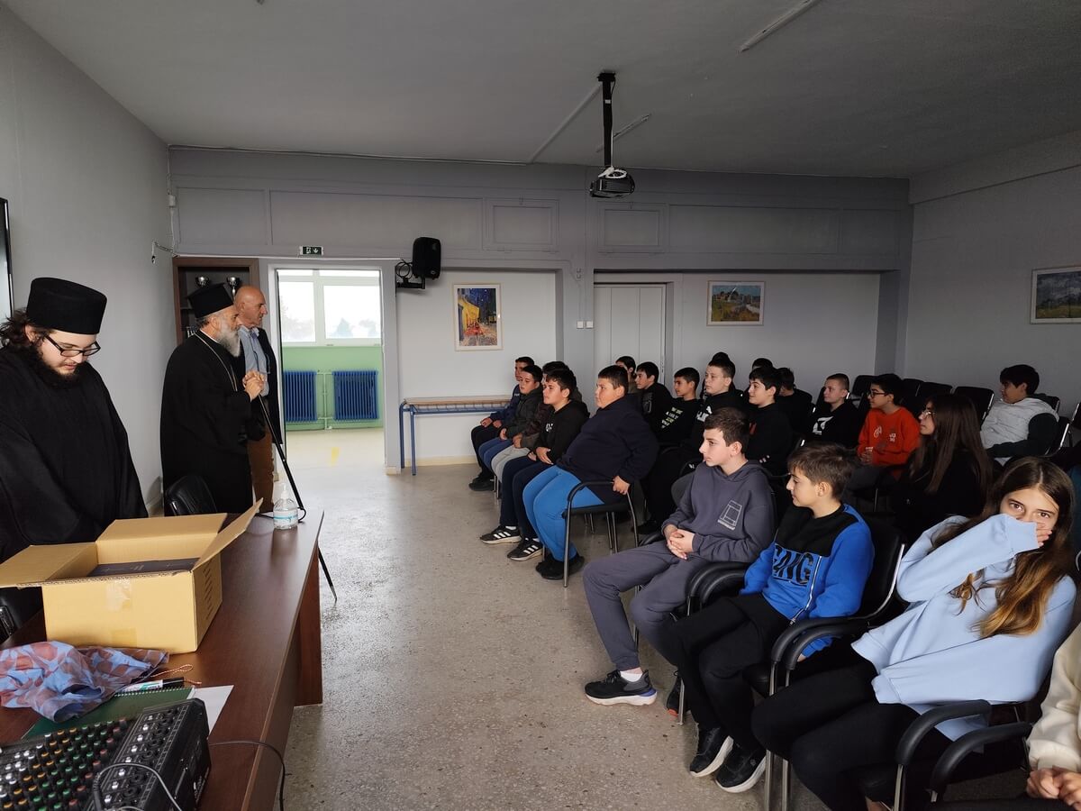Ο Σεβασμιώτατος, συνομιλώντας με τους μαθητές, τους εξήγησε πως ήρθε για να τους δει και να τους προσφέρει την Καινή Διαθήκη για το μάθημα των Θρησκευτικών. Τους προέτρεψε, όταν βρίσκουν λίγο χρόνο, να την διαβάζουν στη νεοελληνική μετάφραση. Τους συμβούλεψε να μην παίζουν μόνο με το κινητό, αλλά με μέτρο, και να διαβάζουν και άλλα βιβλία.