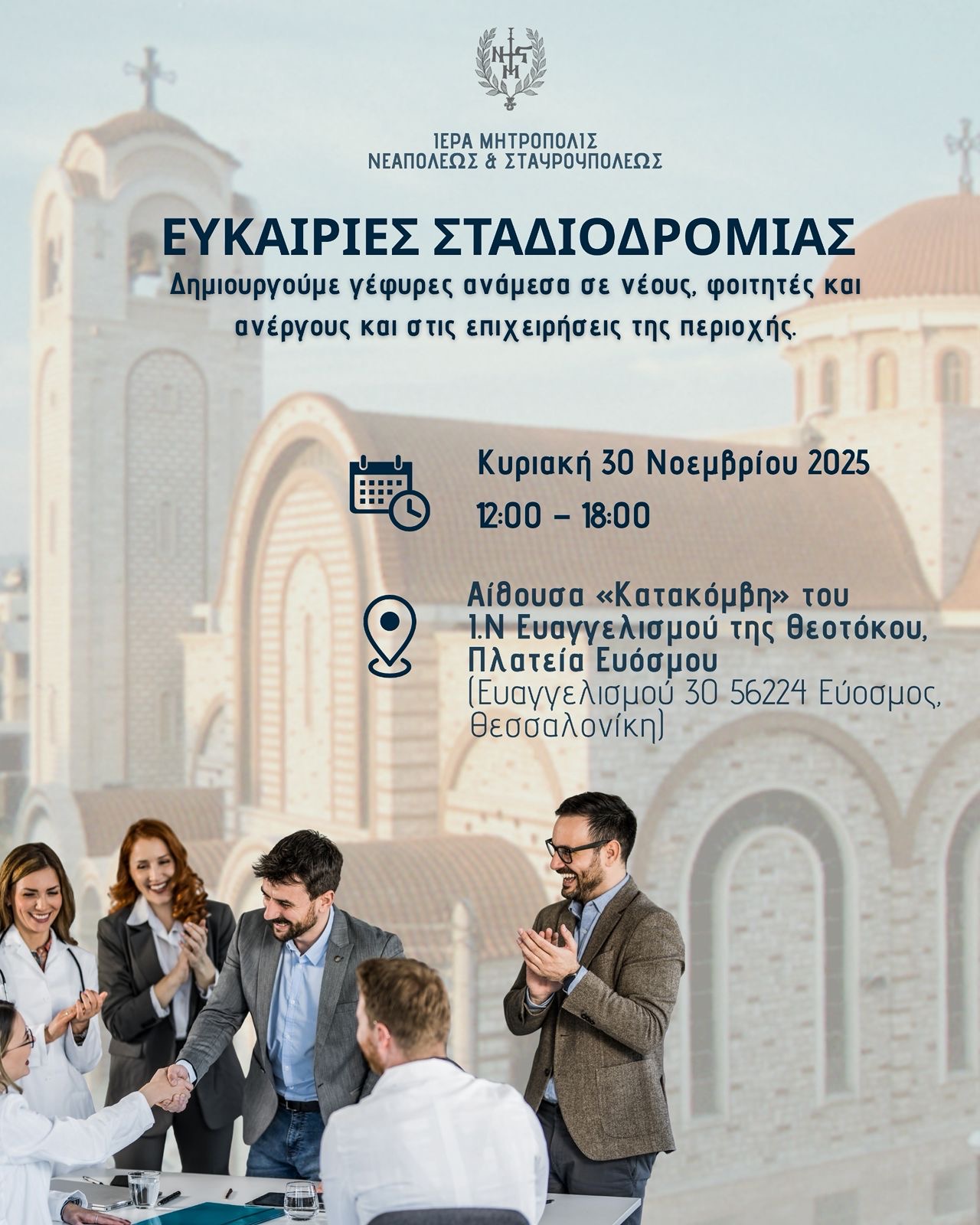 Ο Σεβασμιώτατος Μητροπολίτης της Ιεράς Μητροπόλεως Νεαπόλεως και Σταυρουπόλεως, κ.κ. Βαρνάβας, μας προσκαλεί να συμμετέχουμε στην εκδήλωση με τίτλο «Ευκαιρίες Σταδιοδρομίας» που θα διοργανώσει η Ιερά Μητρόπολις Νεαπόλεως και