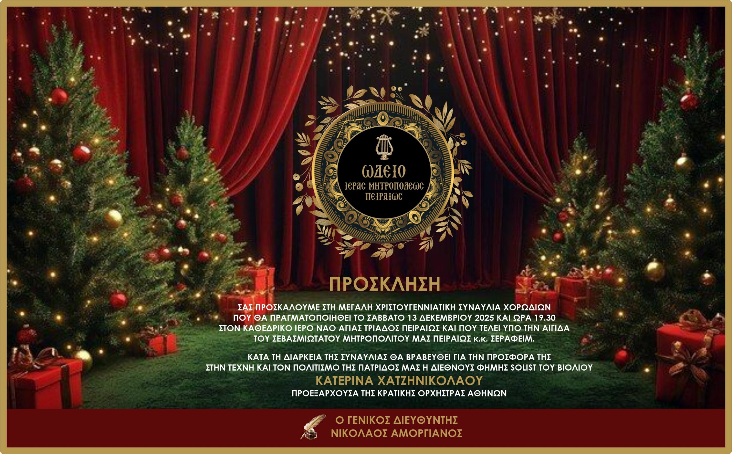 Το Ωδείο της Ιεράς Μητροπόλεως Πειραιώς πραγματοποιεί μεγάλη Χριστουγεννιάτικη Συναυλία Χορωδιών με τραγούδια και ύμνους με τίτλο: «ΧΡΙΣΤΟΥΓΕΝΝΙΑΤΙΚΟ ΑΝΤΑΜΩΜΑ» το Σάββατο 13 Δεκεμβρίου 2025 και ώρα 19.30 στον Καθεδρικό Ιερό Ναό Αγίας Τριάδος Πειραιώς, που τελεί υπό την αιγίδα Του Σεβασμιωτάτου Μητροπολίτου Πειραιώς κ.κ.Σεραφείμ.