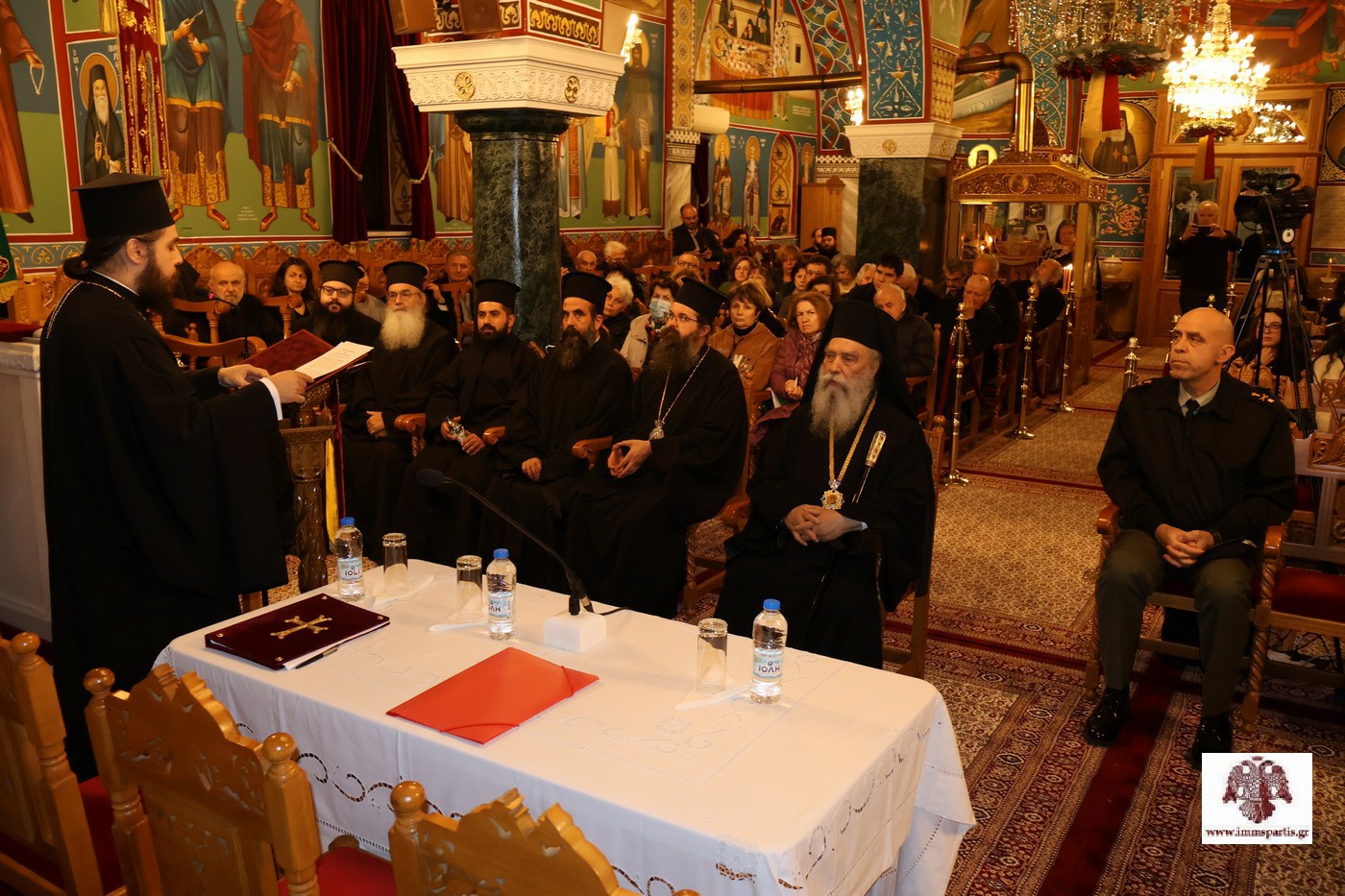 Την εκδήλωση επισφράγισε με τον πατρικό του λόγο ο Σεβασμιώτατος Μητροπολίτης μας κ. Ευστάθιος, ο οποίος αρχικά ευχαρίστησε τους τρεις εισηγητές για τις εμπεριστατωμένες ομιλίες τους, ενώ στάθηκε ιδιαίτερα στον φιλοξενούμενο π. Σεβαστιανό Σωμαράκη, για τον οποίο μίλησε με εγκωμιαστικά λόγια για το ήθος, την θεολογική του κατάρτιση και την προσφορά του σε μία κρίσιμη υπηρεσία της Εκκλησίας της Ελλάδος. Επίσης, με επαινετικά λόγια μίλησε ο σεπτός Ποιμενάρχης μας για τη χορωδία της Σχολής Βυζαντινής Μουσικής της τοπικής μας Εκκλησίας, που πλαισίωσε με εξαιρετικό τρόπο την εσπερίδα. Ολοκληρώνοντας, επισήμανε την πολύτιμη προσφορά των Πατέρων της Ορθοδοξίας, υπογράμμισε ότι η Εκκλησία πρέπει να χαρακτηρίζεται από ομόνοια και να έχει στήριγματά της την θυσιαστική αγάπη και την αλήθεια.
