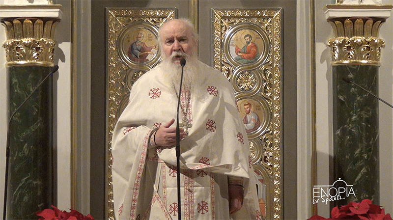 Ο π. Αθανάσιος στο κήρυγμα του και με αφορμή την παραμονή των Χριστουγέννων εστίασε το λόγο του στο μυστήριο της Ενανθρωπήσεως του Υιού του Θεού, όπως αυτό αποκαλύπτεται μέσα από τις Γραφές, την Πατερική παράδοση και τα γεγονότα της Γεννήσεως του Χριστού. Τονίζοντας ότι όλα τα αναγνώσματα της ημέρας —προφητείες, ψαλμοί και ευαγγελικά κείμενα— συγκλίνουν στη μεγάλη αυτή εορτή. Η Παλαιά Διαθήκη προαναγγέλλει τον ερχομό του Μεσσία, ενώ η Καινή Διαθήκη αποκαλύπτει την πραγματοποίησή του στο πρόσωπο του Θεανθρώπου Ιησού Χριστού.