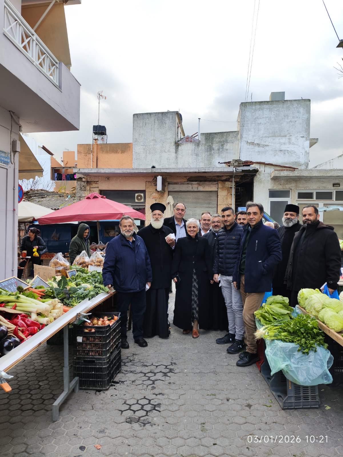 Ο Σεβ. Μητροπολίτης μας κ. Ανδρέας μετά του Δημάρχου Μινώα Πεδιάδος κ. Βασίλη Κεγκέρογλου, κληρικών, Αντιδημάρχων και του Προέδρου της Τοπικής Κοινότητας Αρκαλοχωρίου κ. Γιώργου Μαλεδάκη, επισκέφτηκαν το Σάββατο 3 Ιανουαρίου 2026 την κεντρική αγορά, τη λαχαναγορά και το Αστυνομικό Τμήμα Αρκαλοχωρίου. Ο Σεβασμιώτατος μετά του Δημάρχου διένειμαν ως ευλογία, το ημερολόγιο του 2026 της καθ’ ημάς Ιεράς Μητροπόλεως. Συνομίλησαν με τους πολίτες και αντάλλαξαν ευχές για καλό, ευλογημένο και ειρηνικό το νέο έτος.