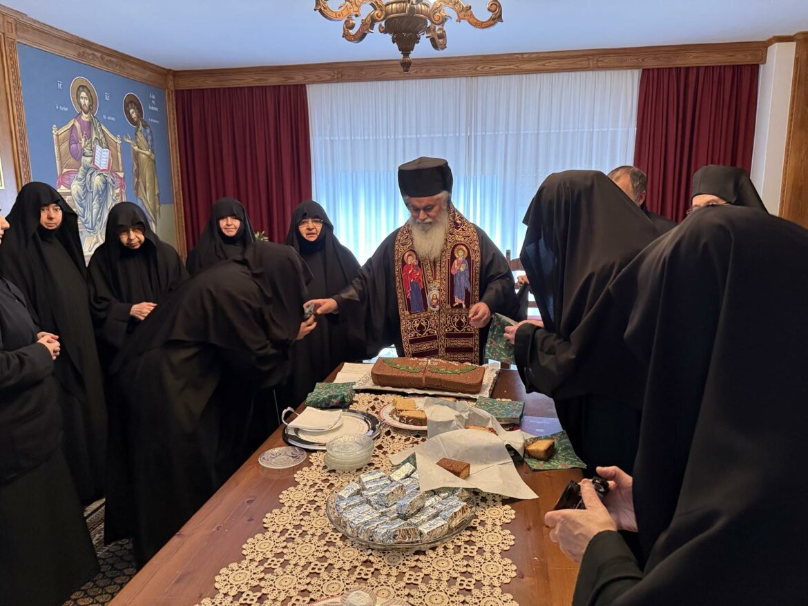 Η Οσιωτάτη Ηγουμένη και οι Μοναχές της Αδελφότητος αντευχήθηκαν προς τον Σεβασμιώτατο, εκφράζοντας με βαθύ σεβασμό και αγάπη την ευγνωμοσύνη τους για τη διαρκή ποιμαντική του φροντίδα, την πατρική του στοργή και την αμέριστη συμπαράστασή του στο πνευματικό τους έργο, δεόμενες υπέρ μακροημερεύσεως και καρποφόρου εξακολουθήσεως της θεοφρουρήτου ποιμαντορίας του Σεβασμιωτάτου Μητροπολίτου μας κ. Ιερωνύμου.