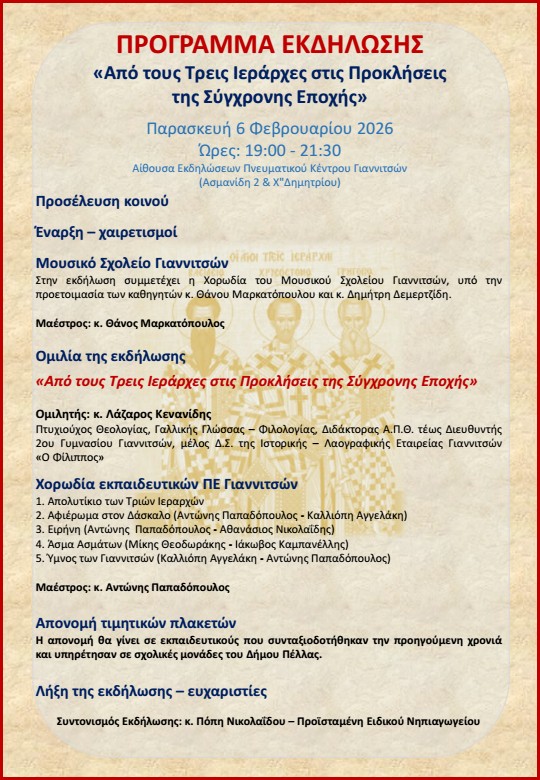 Την Παρασκευή 6 Φεβρουαρίου, ώρα 7.00 μ.μ., στο Πνευματικό Κέντρο Γιαννιτσών θα πραγματοποιηθεί Εκδήλωση αφιερωμένη στους αγίους Τρείς Ιεράρχες.