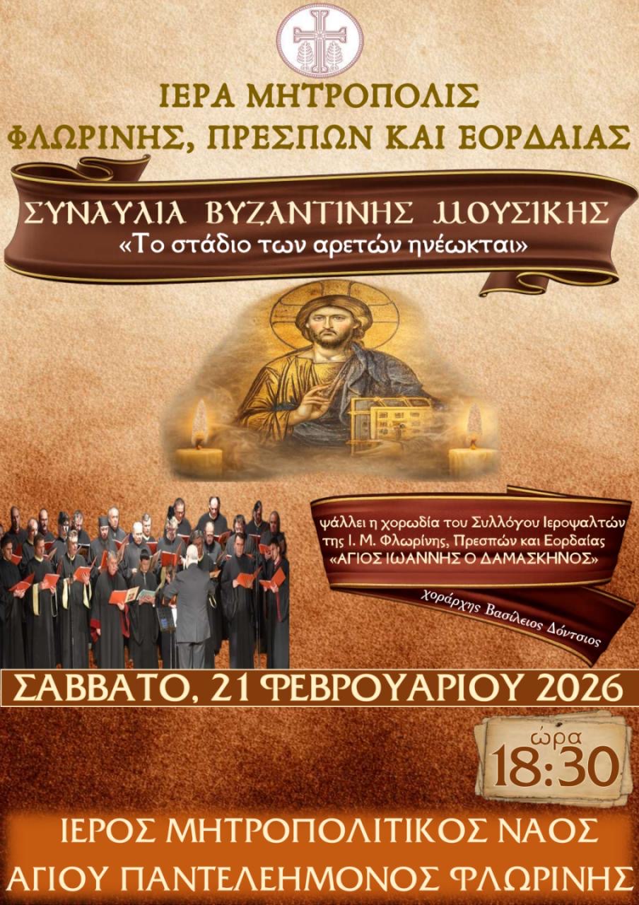 Η Ιερά Μητρόπολη Φλωρίνης, Πρεσπών και Εορδαίας προσκαλεί τους φίλους της βυζαντινής μουσικής σε μια κατανυκτική εκδήλωση με τίτλο: «Το στάδιον των αρετών ηνέωκται», αφιερωμένη στους ύμνους του Τριωδίου.