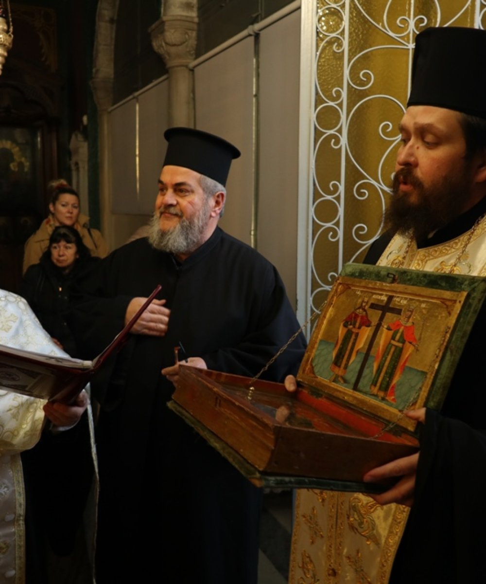 Περατώνοντας την πρώτη εβδαμάδα των νηστειών, αγαπητοί αδελφοί, με την ενίσχυση του Τιμίου και Ζωοποιού Σταυρού και τις πρεσβείες των Αγίων Θεοστέπτων Βασιλέων Κωνσταντίνου και Ελένης, να διέλθουμε το υπόλοιπο της νηστείας με υπομονή, και να αξιωθούμε να προσκυνήσουμε το Άγιο Πάθος και την Ανάσταση του Χριστού.
