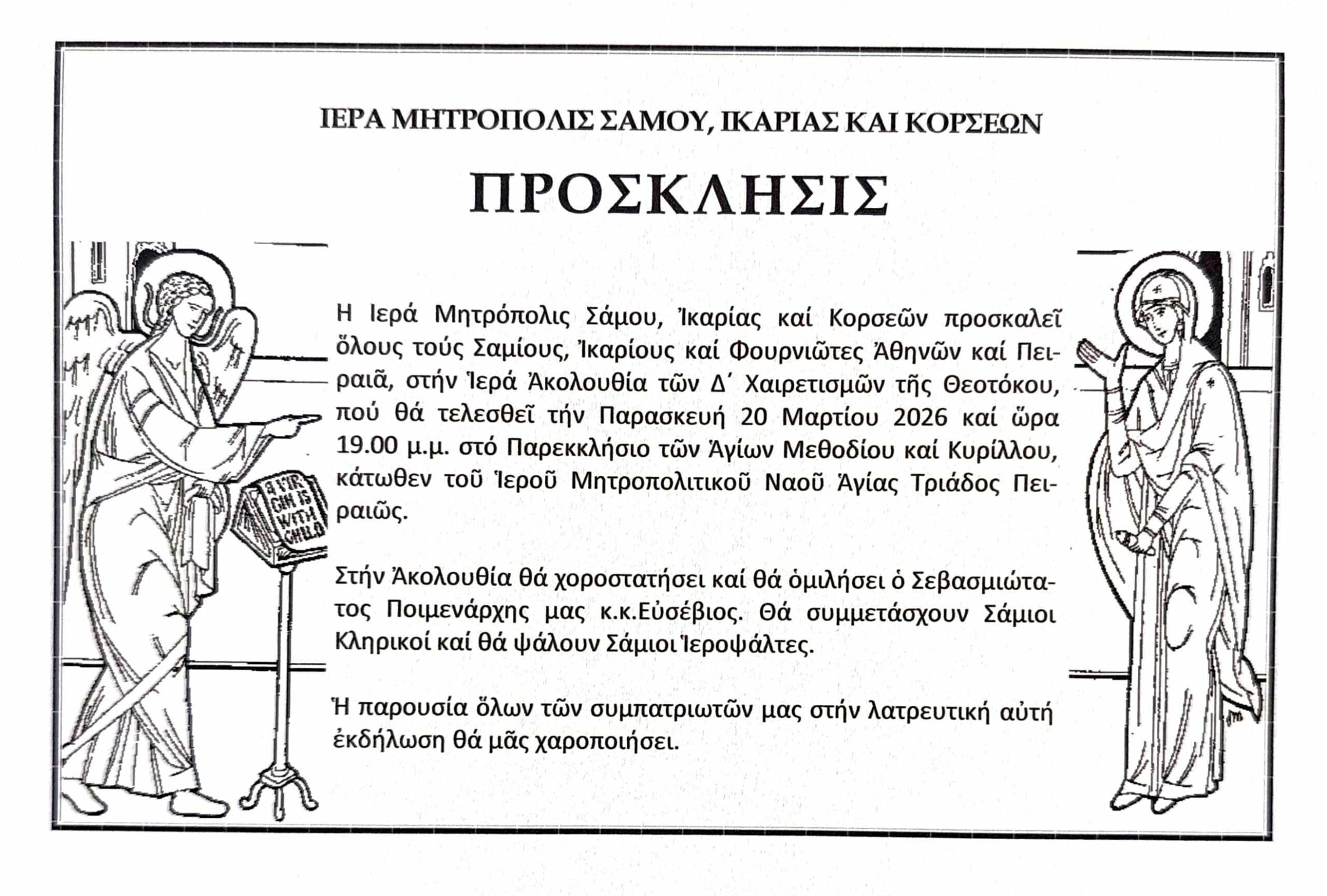 Ἡ Ἱερὰ Μητρόπολις Σάμου, Ἰκαρίας καί Κορσεῶν προσκαλεῖ ὅλους τούς Σαμίους, Ἰκαρίους καί Φουρνιώτες Ἀθηνῶν καί Πειραιᾶ, στήν Ἱερὰ Ἀκολουθία τῶν Δ΄ Χαιρετισμῶν τῆς Θεοτόκου, πού θά τελεσθεῖ τήν Παρασκευή 20 Μαρτίου 2026 καί ὥρα 19.00 μ.μ. στό Παρεκκλήσιο τῶν Ἁγίων Μεθοδίου καί Κυρίλλου, κάτωθεν τοῦ Ἱεροῦ Μητροπολιτικοῦ Ναοῦ Ἁγίας Τριάδος Πειραιῶς.