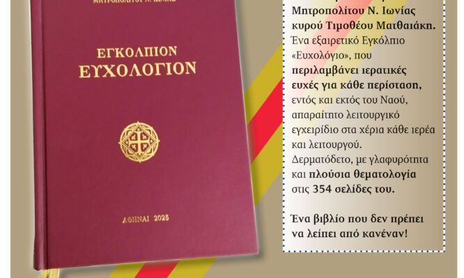 Οι Εκδόσεις «Ορθόδοξη Κιβωτός», με αφορμή τη συμπλήρωση 10 ετών έντυπης κυκλοφορίας, επανακυκλοφορούν το εξαντλημένο βιβλίο «Ευχολόγιο» του πρώην Μητροπολίτου Ν. Ιωνίας κυρού Τιμοθέου Ματθαιάκη.