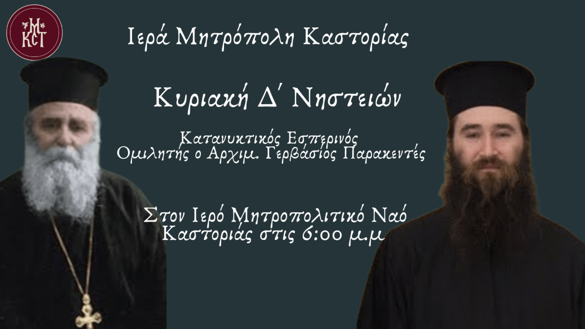 Στο πλαίσιο τῶν φετινῶν ὁμιλιῶν τῶν Κατανυκτικῶν Ἑσπερινῶν τῆς Μεγάλης Τεσσαρακοστῆς, την Κυριακή 22 Μαρτίου τό ἀπόγευμα στις 6.00 μ. μ., στόν Ἱερό Μητροπολιτικό Ναό Κοιμήσεως Θεοτόκου Καστορίας, ὁ Πανοσιολογιώτατος Αρχιμανδρίτης π. Γερβάσιος Παρακεντές θα πραγματοποιήσει ὁμιλία μέ θέμα «Ο ἅγιος Γερβάσιος τῶν Πατρῶν».