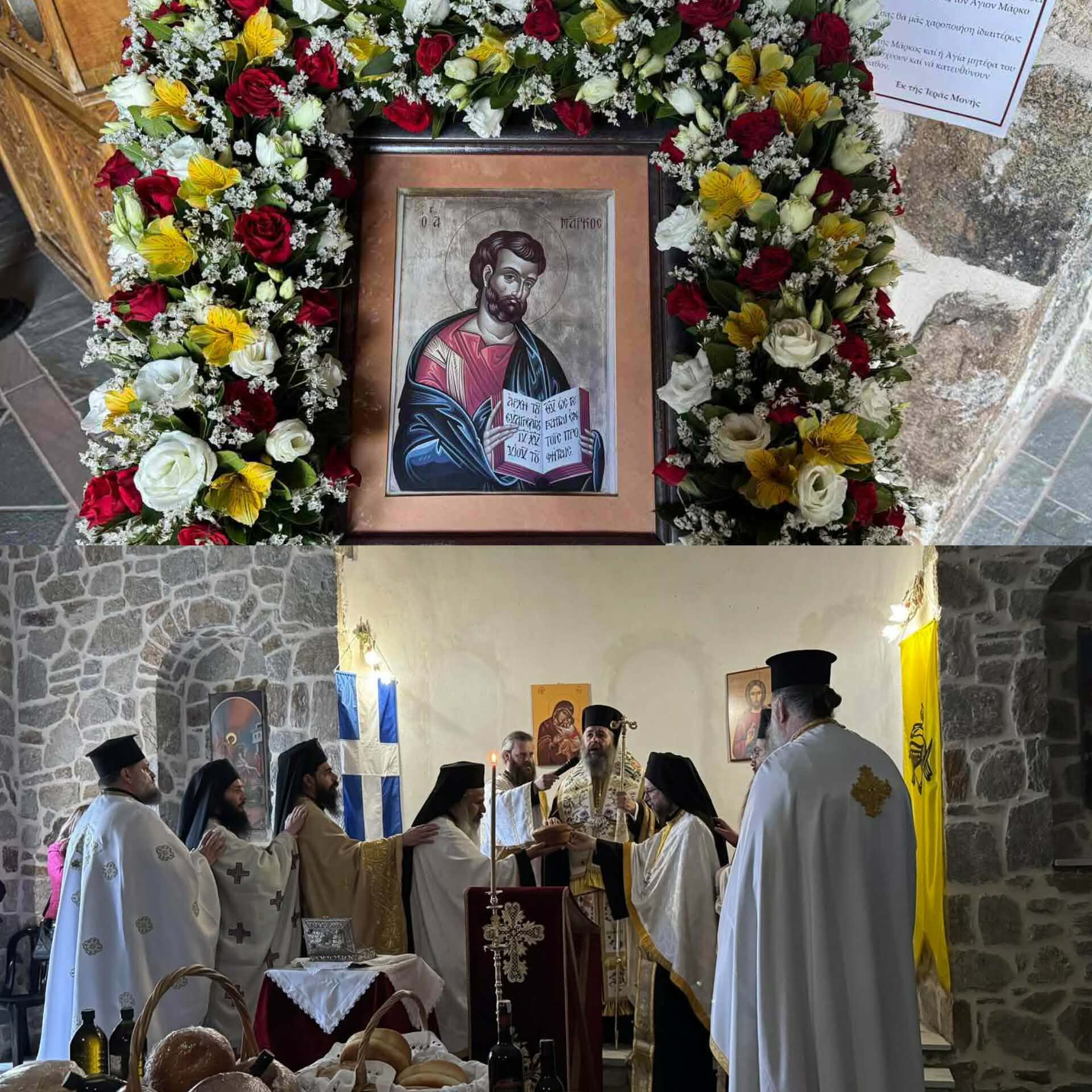 Ο Μητροπολίτης μας, πριν το τέλος της ακολουθίας, ομίλησε καταλλήλως προς το εκκλησίασμα, αναφερόμενος στη μεγάλη μορφή του Αγίου Μάρκου, συγγραφέα του δευτέρου Ευαγγελίου και ιδρυτού της Εκκλησίας της Αλεξανδρείας.