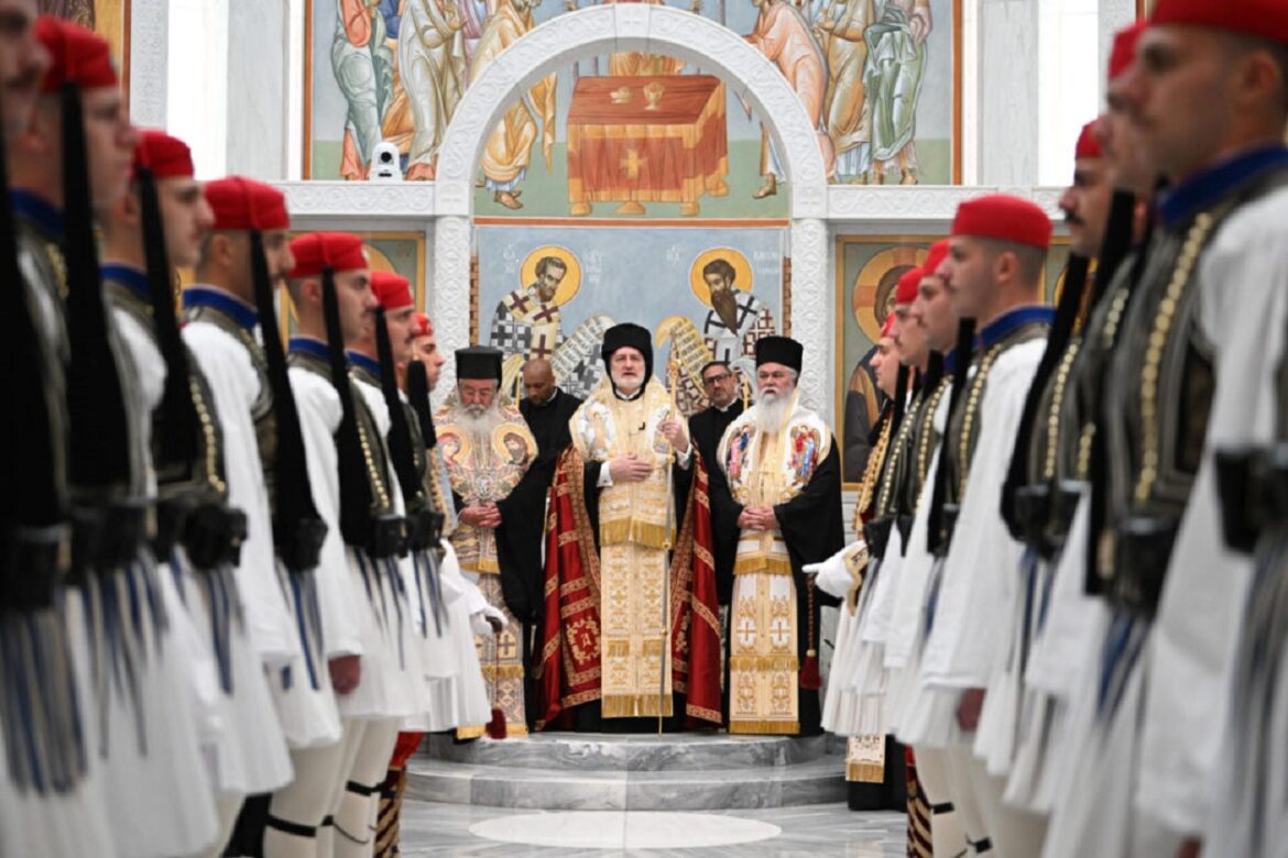 Ξεχωριστή στιγμή αποτέλεσε η ανταλλαγή συμβολικών δώρων, με τους Εύζωνες να προσφέρουν στον Αρχιεπίσκοπο εικόνα του Αγίου Γεωργίου, προστάτη της Προεδρικής Φρουράς, ανήμερα της εορτής του.