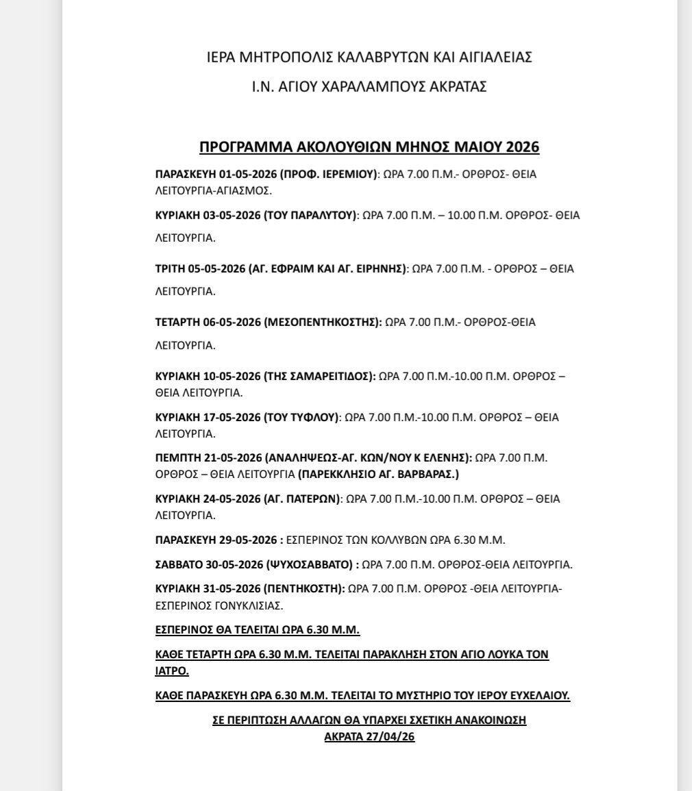 Ενορίες / Μοναστηρια / Προσκυνήματα / Μοναστηριακά ΠροϊόνταΕπικαιρότητα Ναός Αγίου Χαραλάμπους Ακράτας: Πρόγραμμα Ιερών Ακολουθιών Μαΐου από ikivotos 27 Απριλίου 2026 Συντάκτης ikivotos 27 Απριλίου 2026 19 Άγιος Χαράλαμπος ΑκράταςΜητρόπολη Καλαβρύτων Μοιρασου 0 FacebookTwitterPinterestEmail Προηγούμενο άρθρο Μητρόπολη Καλαβρύτων: Προσκύνημα στο Μεσολόγγι Επόμενο άρθρο Όταν κρίνεις τους άλλους ΔΕΙΤΕ ΕΠΙΣΗΣ Η τέχνη συναντά την πίστη: Εγκαίνια της έκθεσης... Η Κυριακή των Μυροφόρων στον Ι.Ν. Αγίας Κυριακής... Μητρόπολη Καλαβρύτων: Προσκύνημα στο Μεσολόγγι Μια ιδιαίτερη συνάντηση στο Επισκοπείο της Φλώρινας Μη χάσετε την “Κιβωτό της Ορθοδοξίας” που κυκλοφορεί... Μητρόπολη Καστορίας: Δημόσια ευχαριστία προς την Υπουργό Πολιτισμού...
