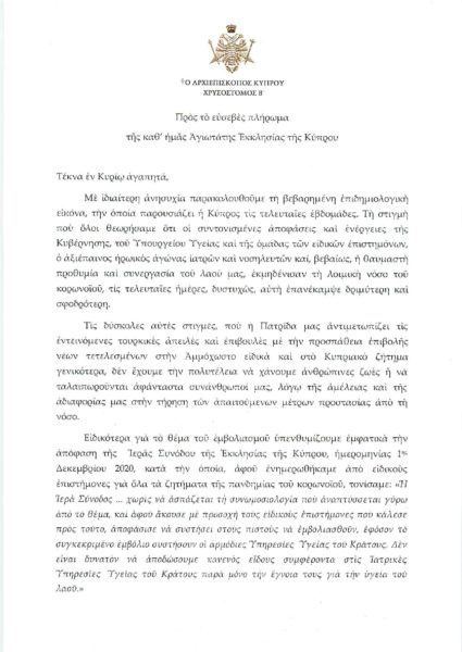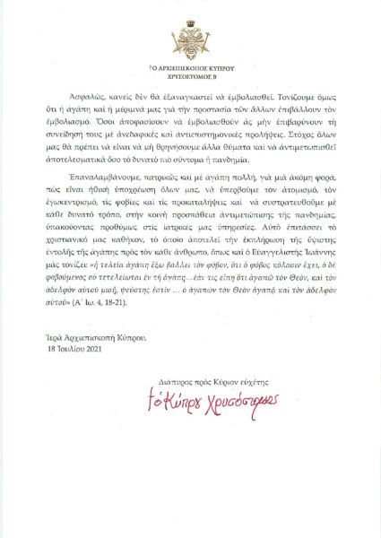 H Αρχιεπισκοπή αναφέρει ότι «Τις δύσκολες αυτές στιγμές, που η Πατρίδα μας αντιμετωπίζει τις εντεινόμενες τουρκικές απειλές και επιβουλές με την προσπάθεια επιβολής νέων τετελεσμένων στην Αμμόχωστο ειδικά και στο Κυπριακό ζήτημα γενικότερα, δεν έχουμε την πολυτέλεια να χάνουμε ανθρώπινες ζωές ή να ταλαιπωρούνται αφάνταστα συνάνθρωποί μας, λόγω της αμέλειας και της αδιαφορίας μας στην τήρηση των απαιτούμενων μέτρων προστασίας από τη νόσο. Η Ιερά Σύνοδος … χωρίς να ασπάζεται τη συνωμοσιολογία που αναπτύσσεται γύρω από αυτό το θέμα, και αφού άκουσε με προσοχή τους ειδικούς επιστήμονες που κάλεσε προς τούτο αποφάσισε να συστήσεις στους πιστούς να εμβολιασθούν, εφόσον το συγκεκριμένο εμβόλιο συστήνουν οι αρμόδιες Υπηρεσίες Υγείας του Κράτους. Δεν είναι δυνατόν να αποδώσουμε κανενός είδους συμφέροντα στις Ιατρικές Υπηρεσίες Υγείας του Κράτους παρά μόνο την έγνοια τους για την υγεία του λαού. Ασφαλώς κανείς δε θα αναγκαστεί να εμβολιαστεί. Τονίζουμε όμως ότι η αγάπη και η μέριμνα μας για την προστασία των άλλων επιβάλλουν τον εμβολιασμό. Όσοι αποφασίσουν να εμβολιασθούν ας μην επιβαρύνουν τη συνείδησή τους με ανεδαφικές και αντιεπιστημονικές προλήψεις. Στόχος όλων μας θα πρέπει να είναι να μη θρηνήσουμε άλλα θύματα και να αντιμετωπισθεί αποτελεσματικά όσο το δυνατό πιο σύντομα η πανδημία».