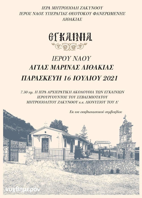 Μεγαλοπρεπώς έγιναν σήμερα, 16.7.2021, τα Εγκαίνια του νεόδμητου (σε τόπο παλαιότερου) Ναού της Αγίας Μαρίνης, Παρεκκλησίου της φιλοπρόοδης Ενορίας Λιθακιάς Ζακύνθου.