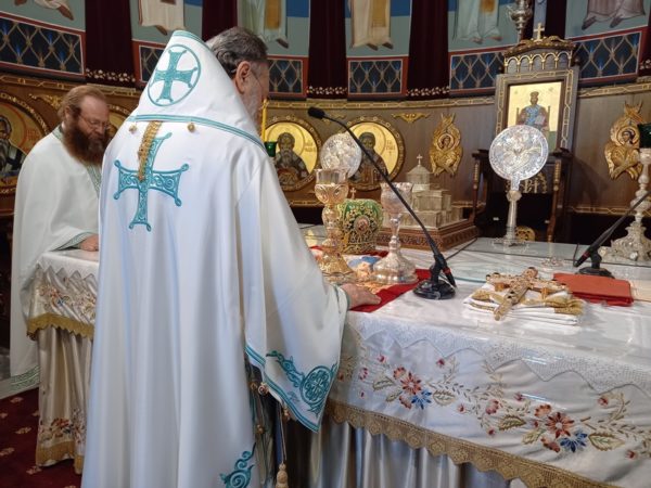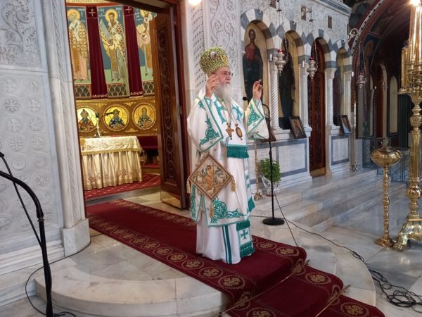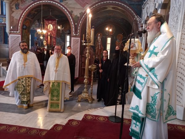 Ο σεπτός Ποιμενάρχης αναφέρθηκε στο ιστορικό πλαίσιο της κλοπής του Τιμίου Σταυρού από τους Πέρσες, την νικηφόρο εκστρατεία που πραγματοποίησε ο Αυτοκράτορας Ηράκλειος και την επιστροφή του Τιμίου Σταυρού από τον ίδιο τον Αυτοκράτορα στην πόλη των Ιεροσολύμων, καθώς και την Ύψωση του Σταυρού από τον Πατριάρχη Ιεροσολύμων Άγιο Ζαχαρία όπου όλοι έψαλλαν το «Σῶσον Κύριε τὸν λαόν σου καὶ εὐλόγησον τὴν κληρονομίαν σου, νίκας τοῖς Βασιλεῦσι κατὰ βαρβάρων δωρούμενος καὶ τὸ σὸν φυλάττων διὰ τοῦ Σταυροῦ σου πολίτευμα», επισημαίνοντας ότι σε αυτό το ιστορικό γεγονός άπαντες έθεσαν πάνω από την ευημερία τους τον Σταυρό του Κυρίου, κάτι που στις μέρες μας γίνεται πλέον σπάνια. Στην συνέχεια ο Ποιμενάρχης μας επεσήμανε ότι και οι Κυριακές, μία πριν την εορτή της Υψώσεως του Τιμίου Σταυρού και μία μετά, είναι αφιερωμένες στον Σταυρό του Χριστού μας και η Εκκλησία μας πολύ διδακτικά τοποθετεί Αποστολικά και Ευαγγελικά αναγνώσματα που αναφέρονται σ᾿ Αυτόν. Ολοκληρώνοντας ο Σεβασμιώτατος προσέθεσε ότι δια του Σταυρού έρχεται η χάρις του Θεού και επειδή αυτό είναι εξαιρετικά δύσκολο να πραγματοποιηθεί βιωματικά ο Απ. Παύλος μας νουθετεί: «Χριστῷ συν εσταύρωμαι· ζῶ δὲ οὐκ έτι ἐγώ, ζῇ δὲ ἐν ἐμοὶ Χριστός» (Γαλ. β’,20), και ευχήθηκε στους παρισταμένους Πιστούς να αξιωθούντην πορεία προς τον Σταυρό και την Ανάσταση!