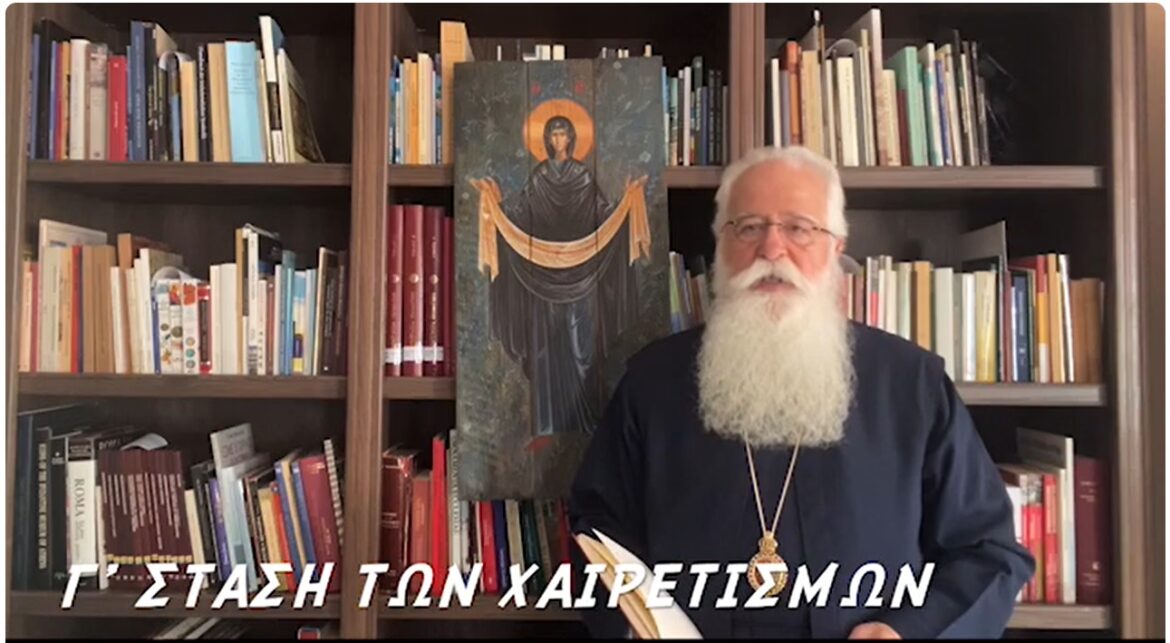 Ξένον τόκον ἰδόντες ξενωθῶμεν τοῦ κόσμου” Με την ελληνική γλώσσα εργαλείο ο υμνογράφος στη σημερινή Στάση των Χαιρετισμών, μας μιλάει για το μυστήριο της Γεννήσεως του Χριστού. Και ταυτόχρονα μας καλεί να “ξενωθῶμεν τοῦ κόσμου”. Όχι να φύγουμε από τον κόσμο, αλλά ν’αφήσουμε πίσω μας τον κόσμο και το κοσμικό πνεύμα. Οι άνθρωποι στις ημέρες μας αναζητούν με τη φυγή από τις πόλεις, να πάρουν μιά αναπνοή, για σωματική ξεκούραση όπως λένε, όμως κουβαλάνε μαζί τους τον κόσμο. Αυτό δεν ξεκουράζει την ψυχή του ανθρώπου. Η ψυχή ξεκουράζεται όταν βρει τον δρόμο της μετάνοιας, όταν βρει τον δρόμο του ουρανού, δηλαδή, αφήνοντας κάθε κοσμική μέριμνα, να μπορεί κανείς να μιλήσει με τον ζωντανό Θεό. Έτσι προετοιμαζόμαστε για την μεγάλη συνάντηση του Πάσχα. Και η Παναγία παραμένει οδηγός μας. “