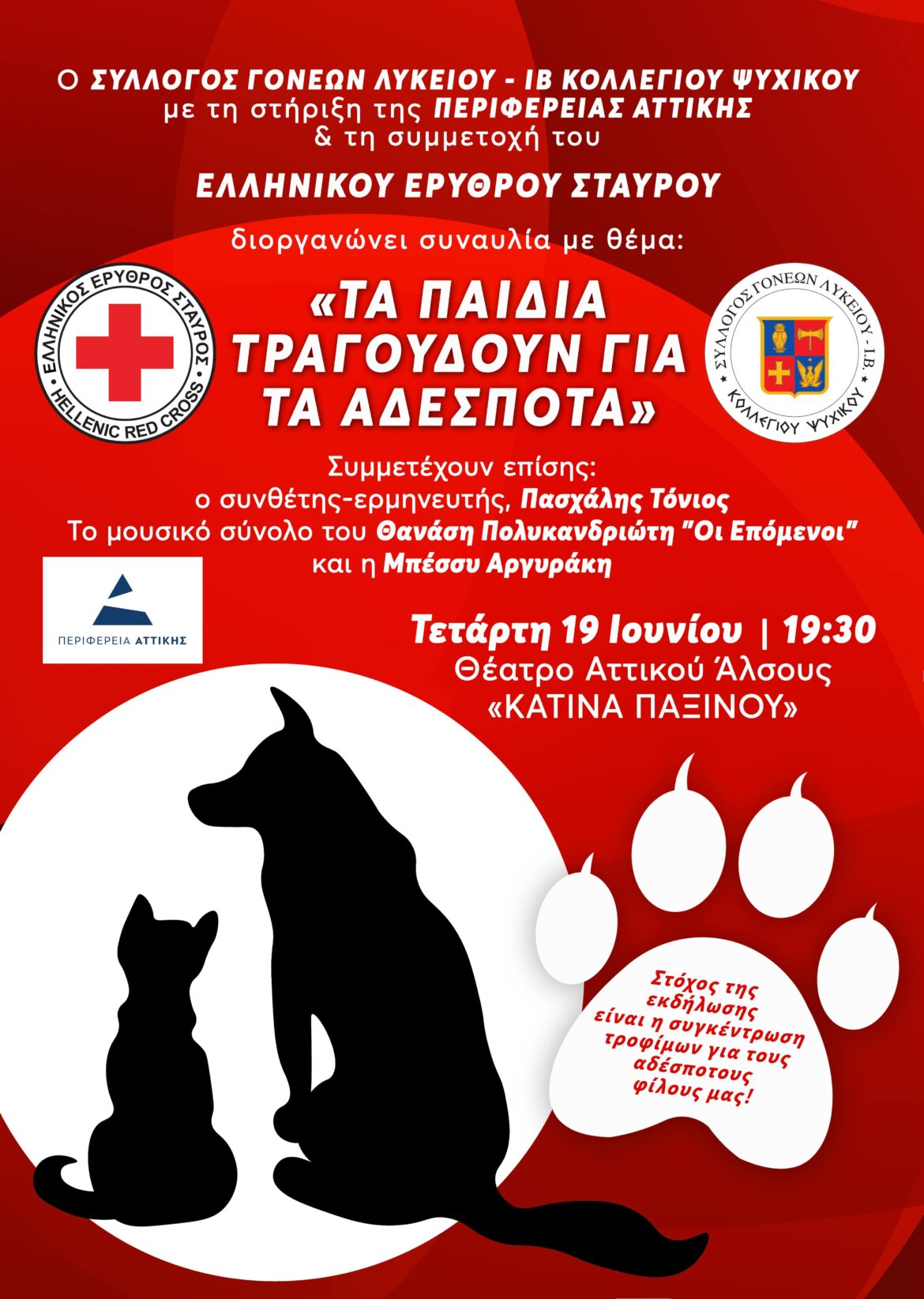 Ο Ελληνικός Ερυθρός Σταυρός, σε συνεργασία με τον Σύλλογο Γονέων Λυκείου ΙΒ – Κολλεγίου Ψυχικού και τη στήριξη της Περιφέρειας Αττικής και της Εντεταλμένης Περιφερειακής Συμβούλου Παρκών, Αλσών & Υγείας Ζώων,κας Ελευθερίας(Ρίτας) Πικρού-Μωραϊτάκη, διοργανώνουν μια ξεχωριστή εκδήλωση – συναυλίαμε θέμα: «Τα παιδιά τραγουδούν για τα αδέσποτα». Η εκδήλωση θα πραγματοποιηθεί την Τετάρτη 19 Ιουνίου 2024, στις 19.30 στο θέατρο «Κατίνα Παξινού» στο Αττικό Άλσος.