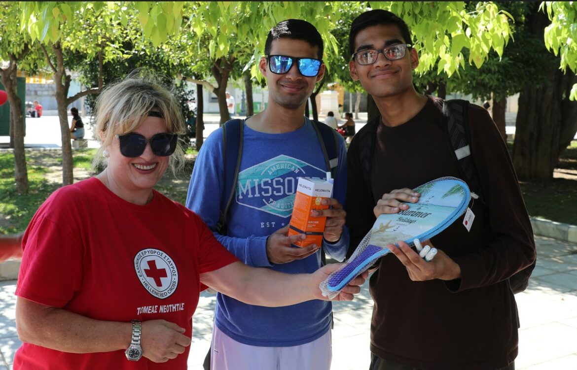 Συγκεκριμένα, ο Τομέας Νεότητας του Ε.Ε.Σ. πραγματοποίησε δράση για παιδιά και εφήβους (9/8), στοχεύοντας στη διάδοση του Ερυθροσταυρικού πνεύματος και της υπέρτατης αξίας του εθελοντισμού στους νέους. Τα παιδιά είχαν τη δυνατότητα να συμμετάσχουν σε βιωματική δράση και διαδραστικά παιχνίδια με αφορμή τις 7 Θεμελιώδεις Αρχές του Κινήματος, γνωρίζοντας μέσα από δραστηριότητες (χειροτεχνίες, κατασκευές, ζωγραφική κ.α.) τη μακρά ιστορία του μεγαλύτερου Ανθρωπιστικού Οργανισμού παγκοσμίως. Παράλληλα, πραγματοποιήθηκε ενημέρωση στους πολίτες για τις υψηλές θερμοκρασίες στο πλαίσιο του προγράμματος «Simplified Early Action Protocol Greece – Extreme Heat» που υλοποιεί ο Ε.Ε.Σ. σε συνεργασία με το Εθνικό Αστεροσκοπείο Αθηνών και τον Διεθνή Ερυθρό Σταυρό, ενώ προσφέρθηκαν εκατοντάδες εμφιαλωμένα μπουκάλια νερό και αντιηλιακές κρέμες στους πολίτες.
