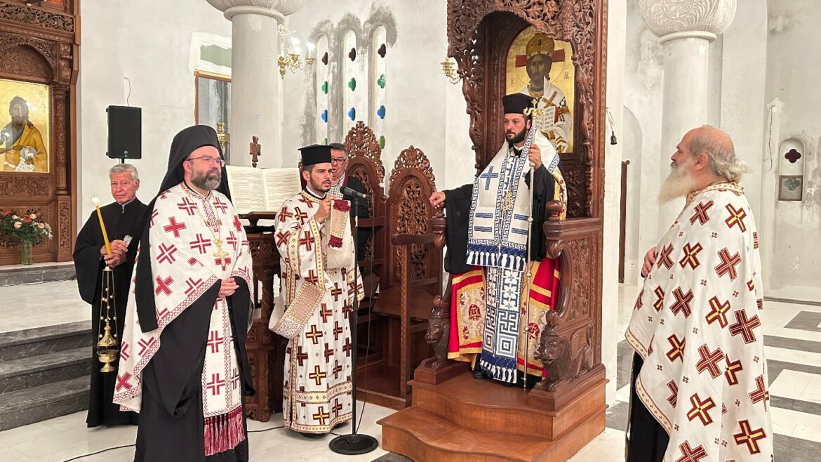 Του πανηγυρικού Εσπερινού το εσπέρας του Σαββάτου 28 Σεπτεμβρίου, ο οποίος έλαβε χώρα στον υπό αποπεράτωση ιερό Ναό του Αγίου, χοροστάτησε ο Θεοφιλέστατος Επίσκοπος Ολύμπου κ. Κύριλλος.
