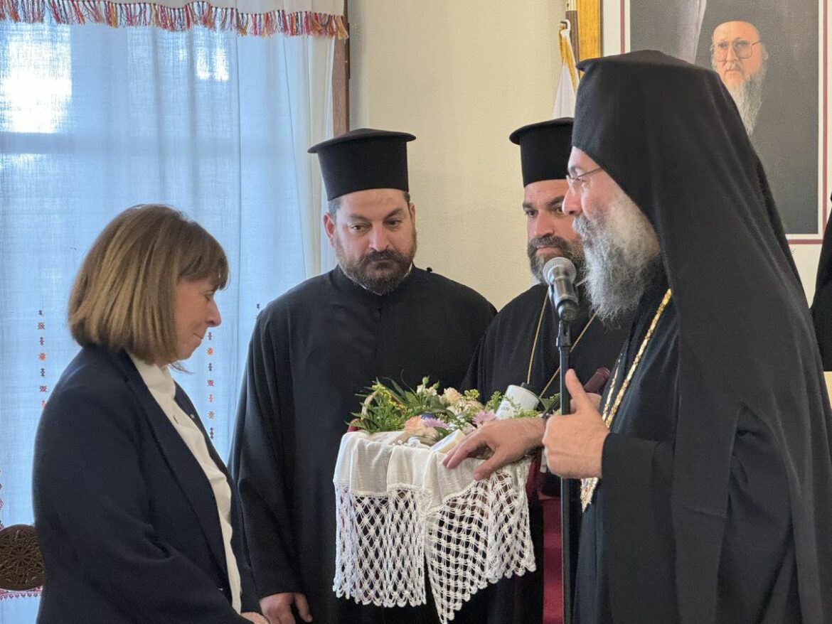 Την 12η μεσημβρινή αφίχθηκε στην Ιερά Μονή η Α.Ε. η Πρόεδρος της Δημοκρατίας κ. Αικατερίνα Σακελλαροπούλου, συνοδευόμενη από τον Εκπρόσωπο της Ελληνικής Κυβερνήσεως, Εξοχώτατο κ. Ιωάννη Κεφαλογιάννη, Υφυπουργό Εθνικής Άμυνας, και τις Τοπικές Πολιτικές, Στρατιωτικές και Αστυνομικές Αρχές, και παρέστη στη Δοξολογία, στην οποία προέστη ο Σεβασμιώτατος Αρχιεπίσκοπος Κρήτης κ. Ευγένιος.