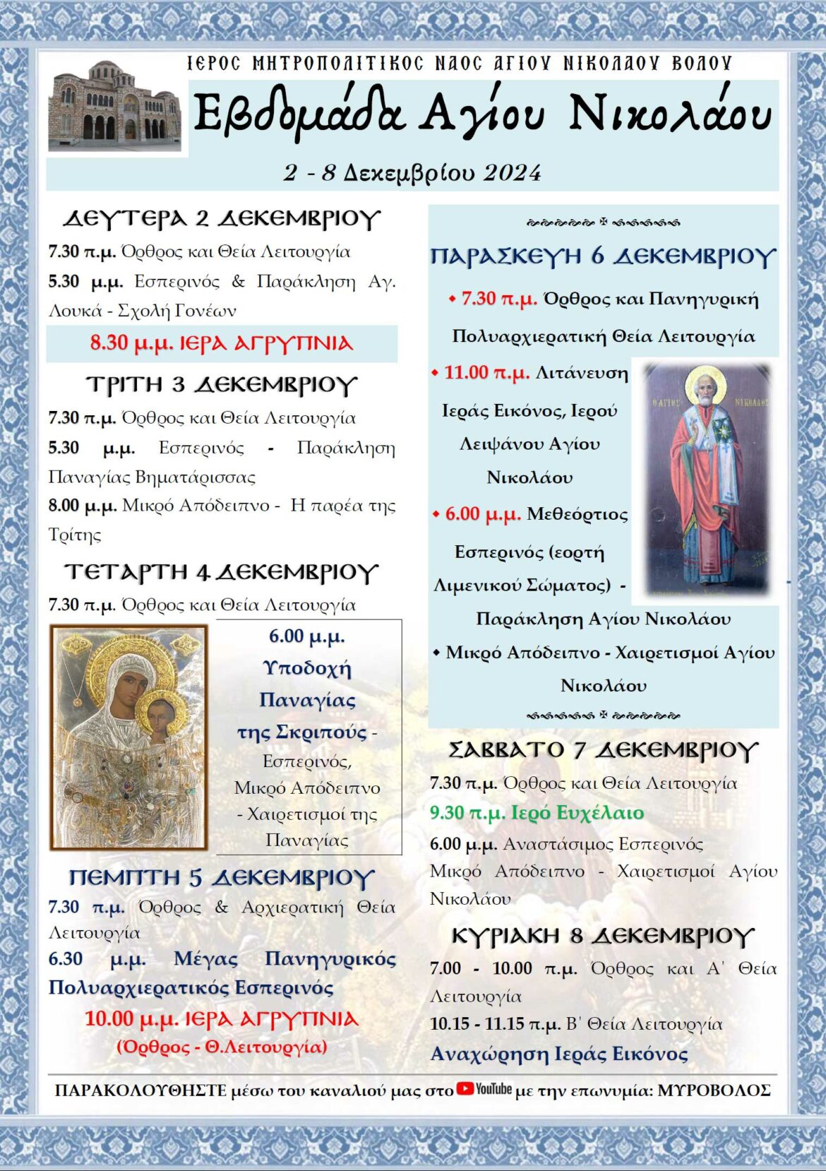 Εβδομάδα λατρευτικών εκδηλώσεων ενόψει της εορτής του Πολιούχου μας Αγίου Νικολάου, θα διεξαχθεί στον Μητροπολιτικό Ιερό Ναό του Βόλου από 2 έως 8 Δεκεμβρίου.