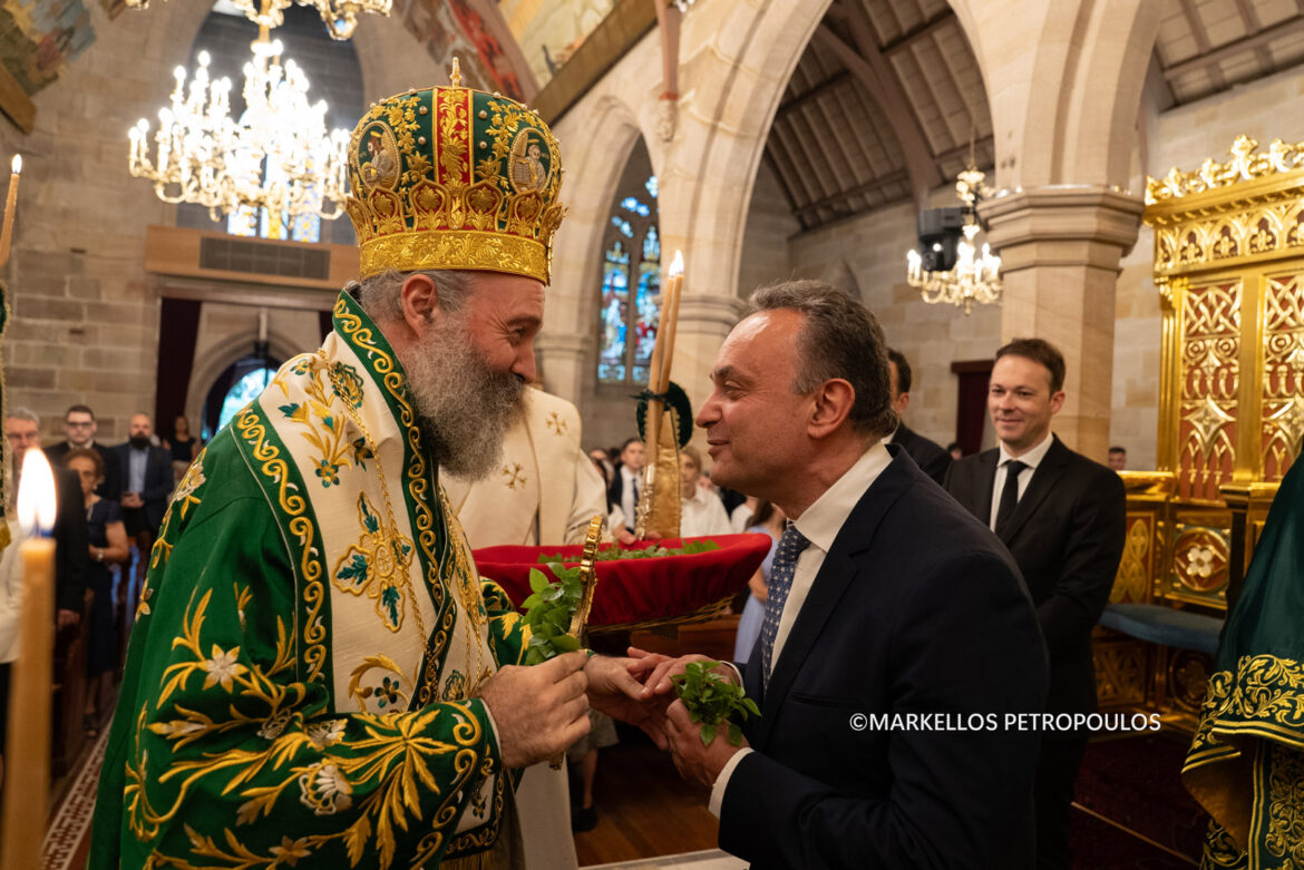 Τον Σεβασμιώτατο πλαισίωσαν ο Πρωτοσύγκελλος της Ιεράς Αρχιεπισκοπής και Ιερατικώς Προϊστάμενος του Καθεδρικού Ναού, Πανοσιολογιώτατος Αρχιμανδρίτης του Οικουμενικού Θρόνου κ. Χριστοφόρος Κρικέλης, ο συνεφημέριός του, Πανοσιολογιώτατος Αρχιμανδρίτης κ. Στέφανος Τινικασβίλι, και άλλοι κληρικοί. Ανάμεσα στο πολυπληθές εκκλησίασμα βρίσκονταν ο Πρέσβης της Ελλάδος στην Αυστραλία κ. Σταύρος Βενιζέλος, ο Ύπατος Αρμοστής της Κύπρου στην Αυστραλία κ. Αντώνιος Σαμμούτης, ο Γενικός Πρόξενος της Ελλάδος στο Σύδνεϋ κ. Ιωάννης Μαλλικούρτης, οι Βουλευτές, μέλη αντιπροσωπίας της Βουλής των Ελλήνων, κ.κ. Σταύρος Κελέτσης, Αθανάσιος Παπαθανάσης, Στέφανος Παραστατίδης και Μιλτιάδης Ζαμπάρας, ο Άρχων της Μ.τ.Χ.Ε. και Αντιπρόεδρος του Αρχιεπισκοπικού Συμβουλίου κ. Θεοδόσιος Πενκλής, κ.ά..